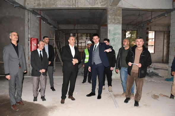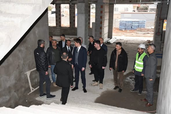 Fırat Mahallesi’nde hayırsever Bilgin Ailesi tarafından yaptırılan okul inşaatını kurum müdürleri ve İlçe Millî Eğitim Şube Müdürleri ile birlikte gezen Çakır, çalışmaların son durumu hakkında yetkililerden bilgi aldı.