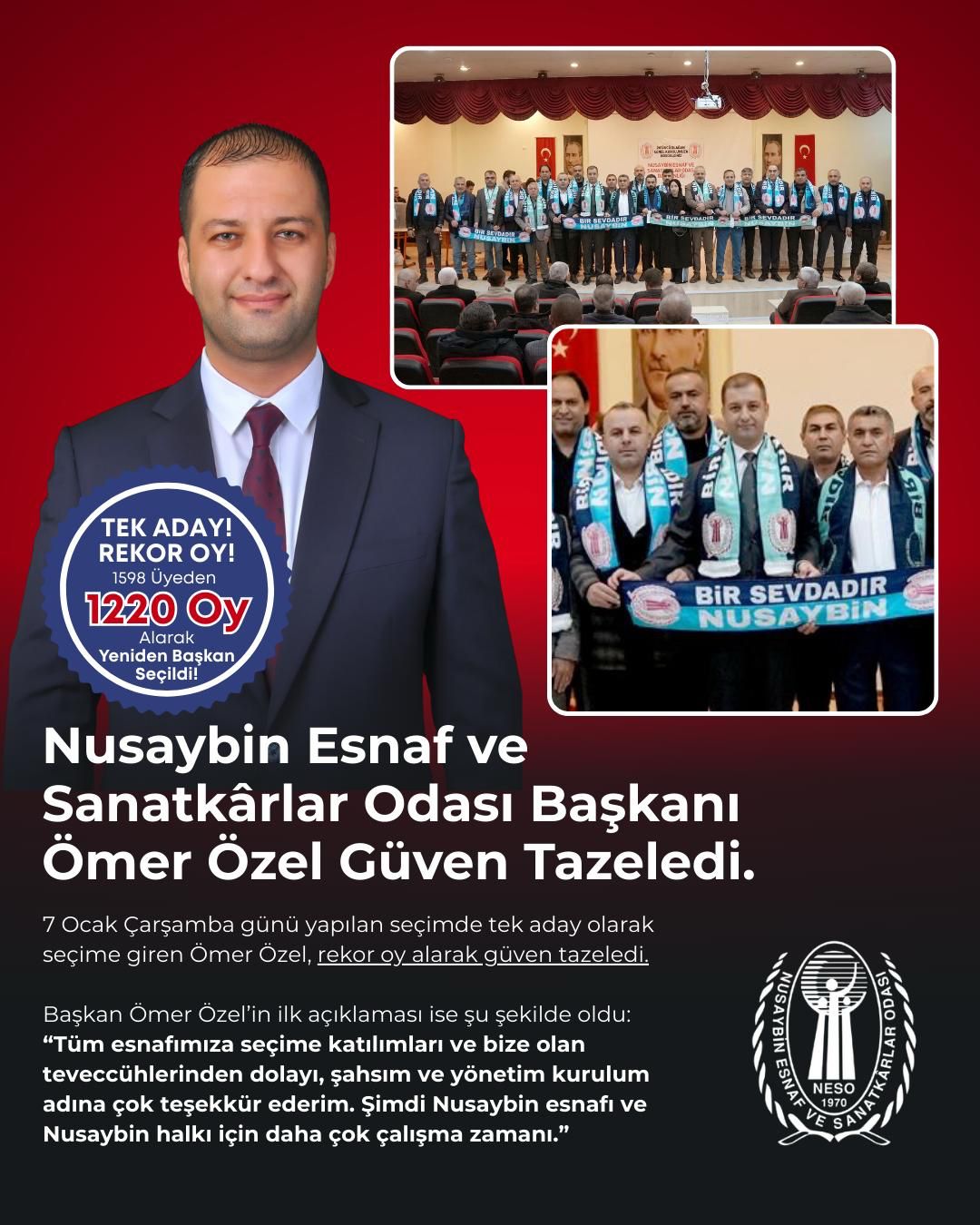 Mardin’in Nusaybin ilçesinde Esnaf ve Sanatkârlar Odasının (NESO) olağan genel kurulunda tek aday olan mevcut başkan Ömer Özel, rekor oyla yeniden başkanlığa seçildi.