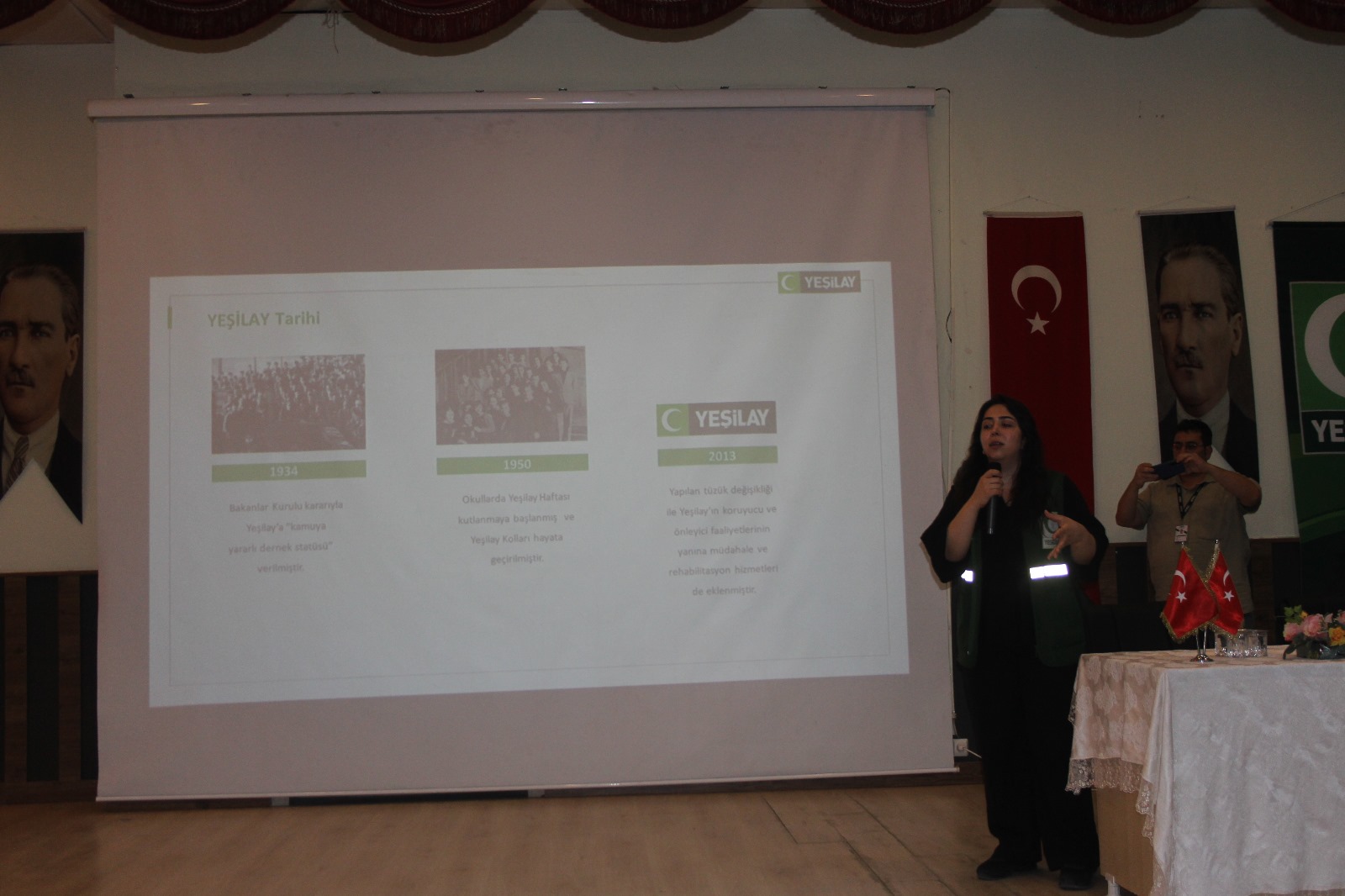 Ardından YEDAM (Yeşilay Danışmanlık Merkezi) görevlisi Sultan Solmaz sunum yaptı. Solmaz, bağımlılıkla mücadelede Yeşilay Danışmanlık Merkezlerinin önemine dikkat çekerek merkezin sunduğu hizmetler hakkında bilgi verdi.