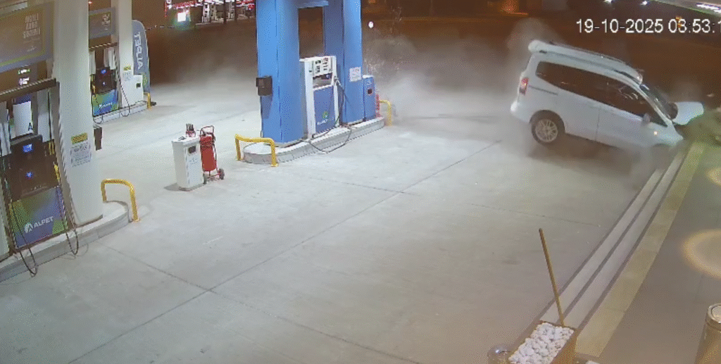 Kaza, sabah saat 04.30 sıralarında uluslararası İpekyolu üzerindeki Barış Petrol mevkisinde meydana geldi. Henüz sürücüsünün kimliği öğrenilemeyen 73 AAT 496 plakalı hafif ticari araç, virajı alamayarak akaryakıt istasyonuna girdi. Araç, benzin dolum pompalarına çarpmadan iş yerinin merdivenlerinde durdu.