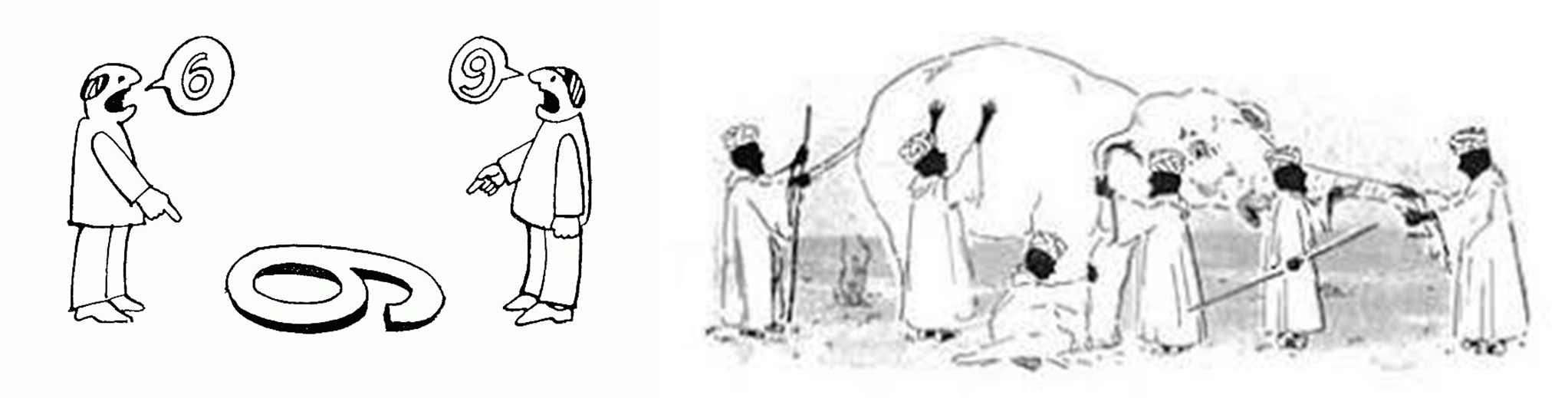 Wekî din di mînaka fîl de jî, ceribandineke ku li ser têgihîştina fîl hatiye çêkirin em dibînin. Ev ceribandina navborî ji bo mirovên Hîndî yên ku berê qet fîl nedîtine hatiye çêkirin. Di ceribandinê de fîlek ku di hawîrdoreke tarî de hatiye bicihkirin û ji pirsa fîl çi ye re bersiv hatiye xwestin. Her kesên ku ketiye hundir bi destên xwe temasê fîl kiriye û piştre bersivan daye. Di encamê de yek ji wan gotiye “fîl dişebe xortumeke avê” ji ber ku destê xwe daye xortuma fîl, yê din gotiye “fîl dişibe sitûnê” ji ber ku destê xwe daye lingê fîl û yekî din jî gotiye “fîl dişibe baweşîn” ji ber ku ew jî destê xwe daye guhê fîl. Bi vî şeklî li gorî destdana fîl bersivên her kesî cuda bûne.